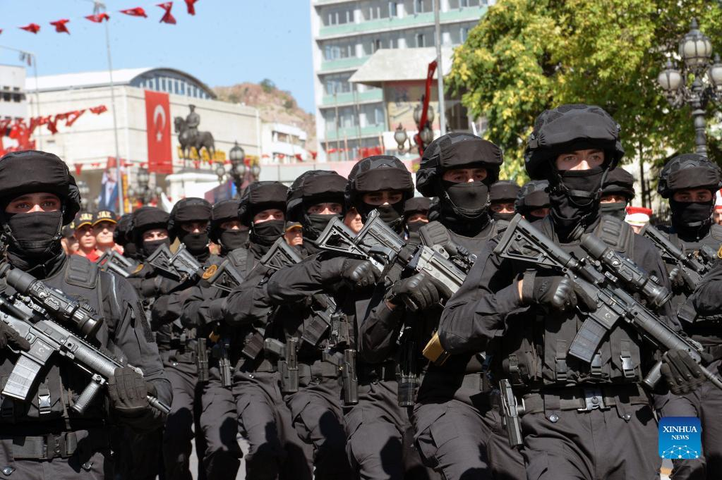 Turkish soldiers march during a parade to mark the 100th anniversary of Victory Day in Ankara, Trkiye, on Aug. 30, 2022. Trkiye celebrated on Tuesday the 100th anniversary of Victory Day, marking the Turkish victory against Greek forces in a decisive battle during the Turkish War of Independence in 1922. (Photo by Mustafa Kaya/Xinhua)