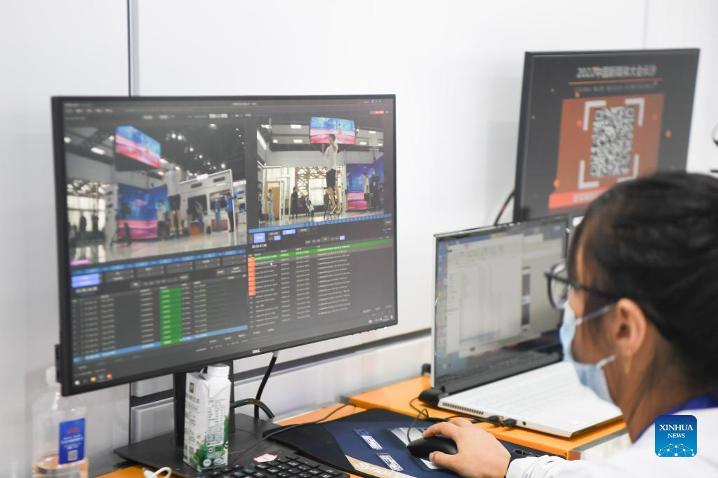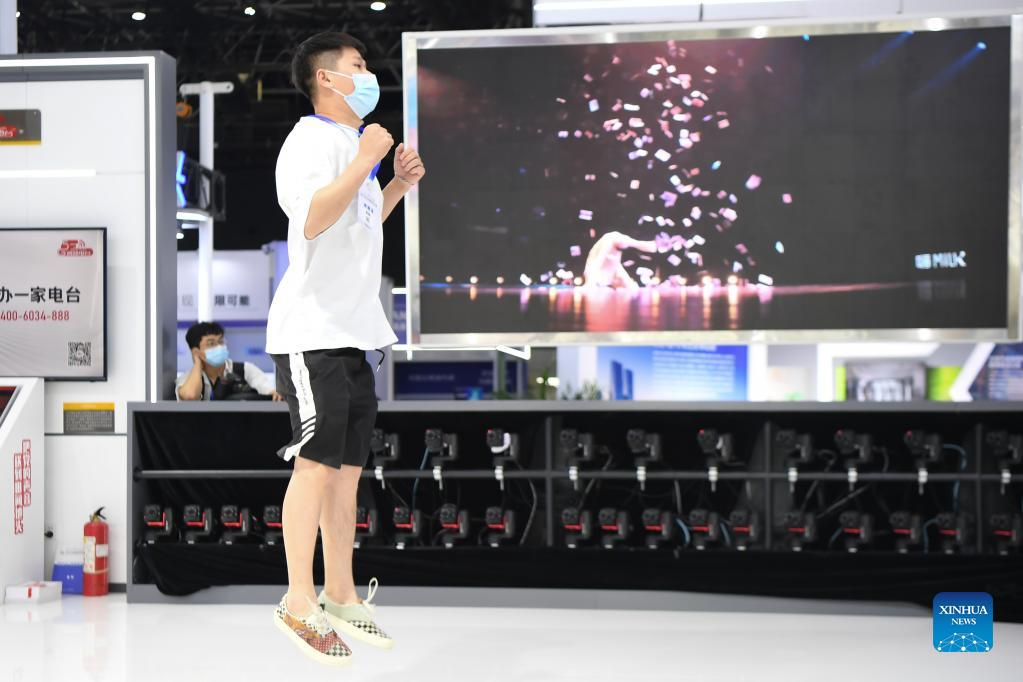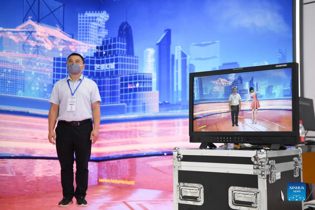 A staff member shows the operation of XR immersive studio during the 2022 China New Media Conference in Changsha, central China's Hunan Province, Aug. 30, 2022. The 2022 China New Media Conference, organized by the All-China Journalists Association and the publicity department of the Communist Party of China (CPC) Hunan provincial committee, kicked off Tuesday in Changsha. (Xinhua/Xue Yuge)
