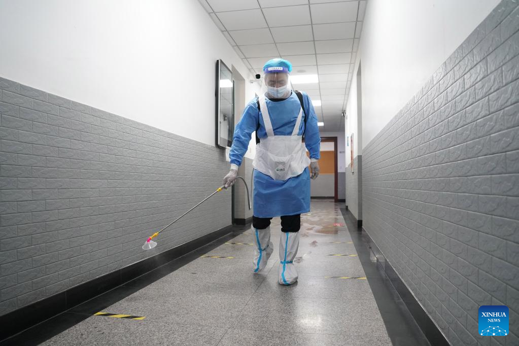 A staff member disinfects the corridor in Zhongguancun High School in Haidian District of Beijing, capital of China, Aug. 30, 2022. Schools in Zhongguancun area of Haidian District have organized staff members to make full preparation for the upcoming new semester. (Xinhua/Ren Chao)