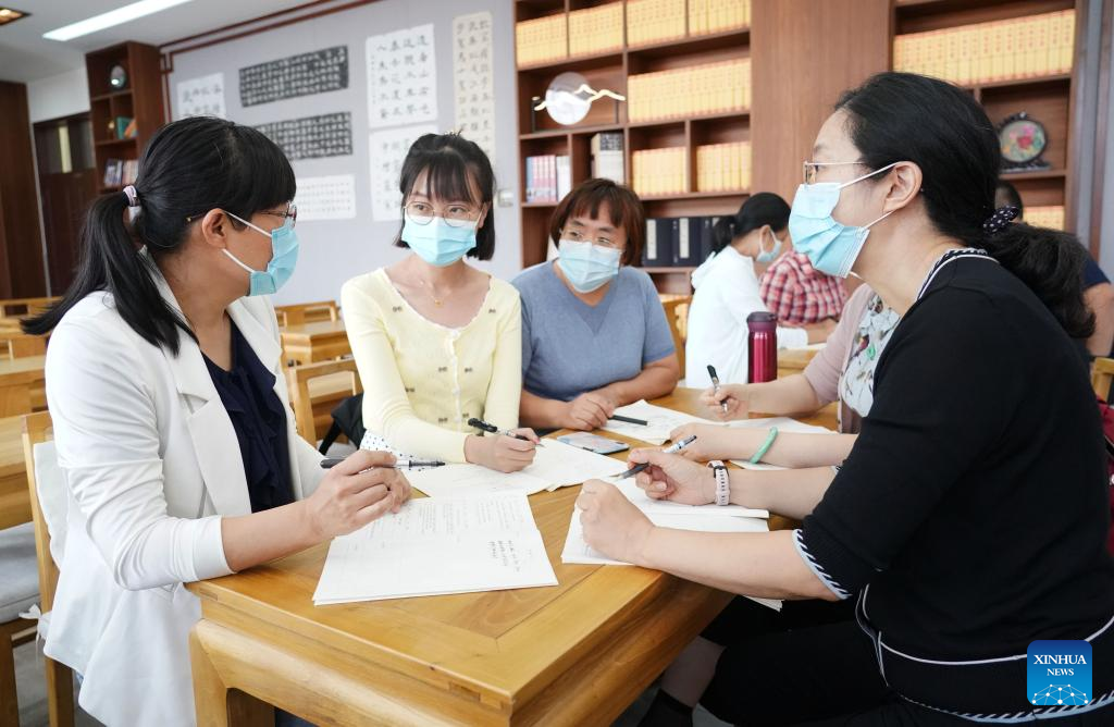 Teachers attend teaching and research activities in Zhongguancun High School in Haidian District of Beijing, capital of China, Aug. 30, 2022. Schools in Zhongguancun area of Haidian District have organized staff members to make full preparation for the upcoming new semester. (Xinhua/Ren Chao)