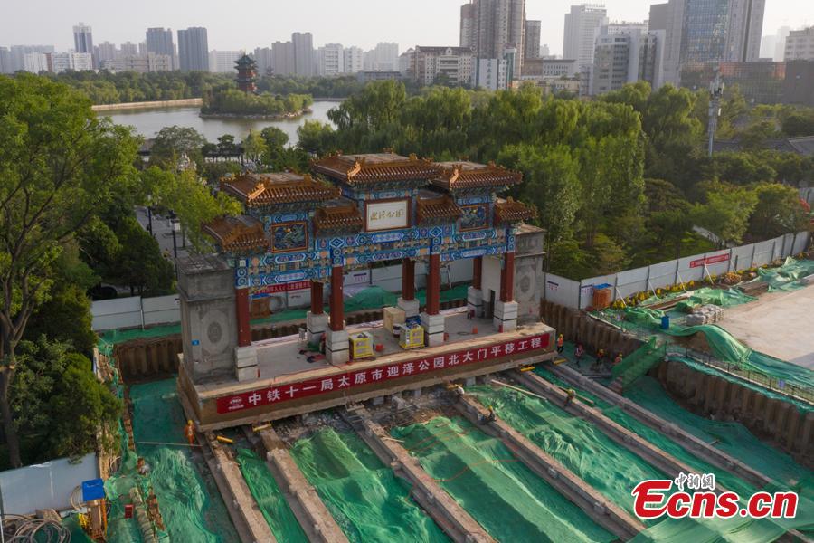 Aerial phone shows the relocated archway of Yingze Park in Taiyuan, Shanxi Province, Aug. 30, 2022. (Photo: China News Service)