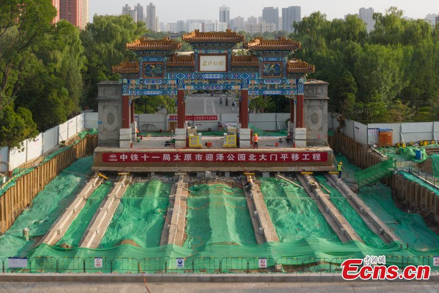 Aerial phone shows the relocated archway of Yingze Park in Taiyuan, Shanxi Province, Aug. 30, 2022. (Photo: China News Service)
