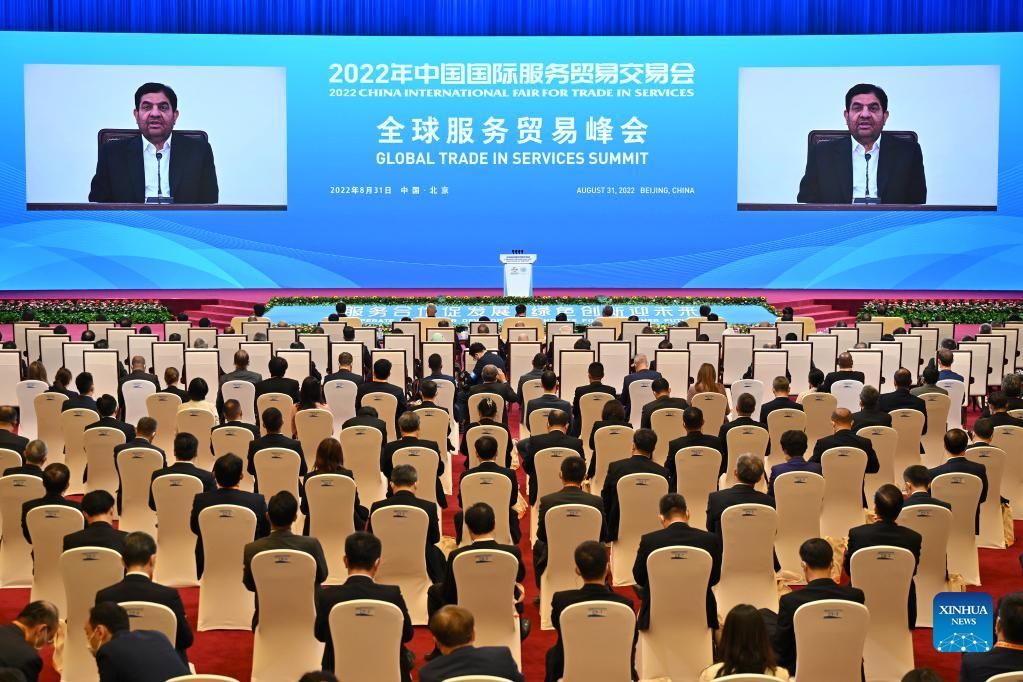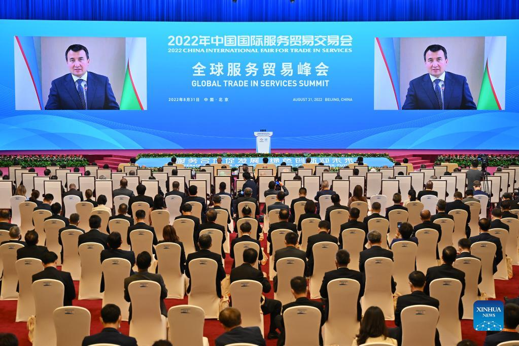 Jamshid Khodjayev, Deputy Prime Minister and Minister of Investments and Foreign Trade of Uzbekistan, addresses the Summit of the 2022 China International Fair for Trade in Services (CIFTIS) via video, Aug. 31, 2022. The summit was held in Beijing on Wednesday. (Xinhua/Li Xin)