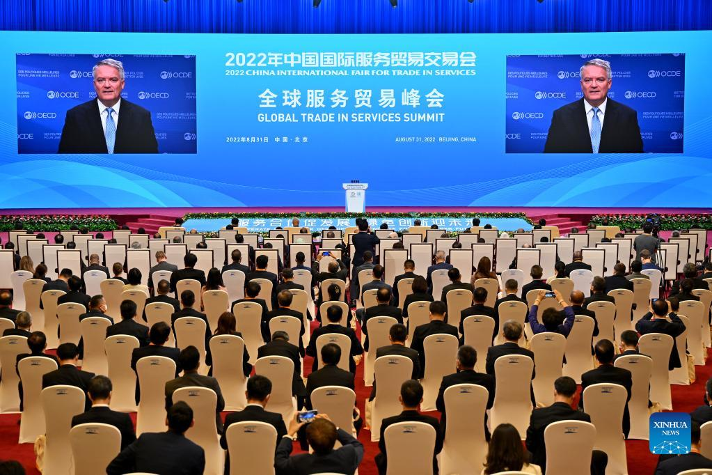 Mathias Cormann, Secretary-General of the Organization for Economic Co-operation and Development (OECD), addresses the Summit of the 2022 China International Fair for Trade in Services (CIFTIS) via video, Aug. 31, 2022. The summit was held in Beijing on Wednesday. (Xinhua/Li Xin)