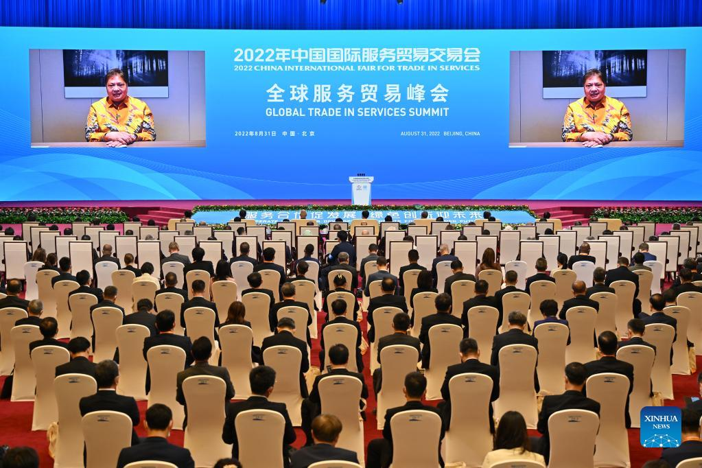 Airlangga Hartarto, Indonesian Coordinating Minister for Economic Affairs, addresses the Summit of 2022 China International Fair for Trade in Services (CIFTIS) via video, Aug. 31, 2022. The summit was held in Beijing on Wednesday. (Xinhua/Li Xin)