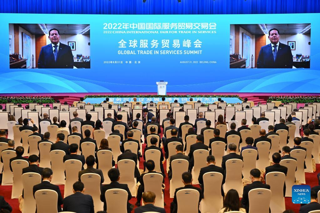 Vice President Hamilton Mourao of Brazil addresses the Summit of the 2022 China International Fair for Trade in Services (CIFTIS) via video, Aug. 31, 2022. The summit was held in Beijing on Wednesday. (Xinhua/Li Xin)