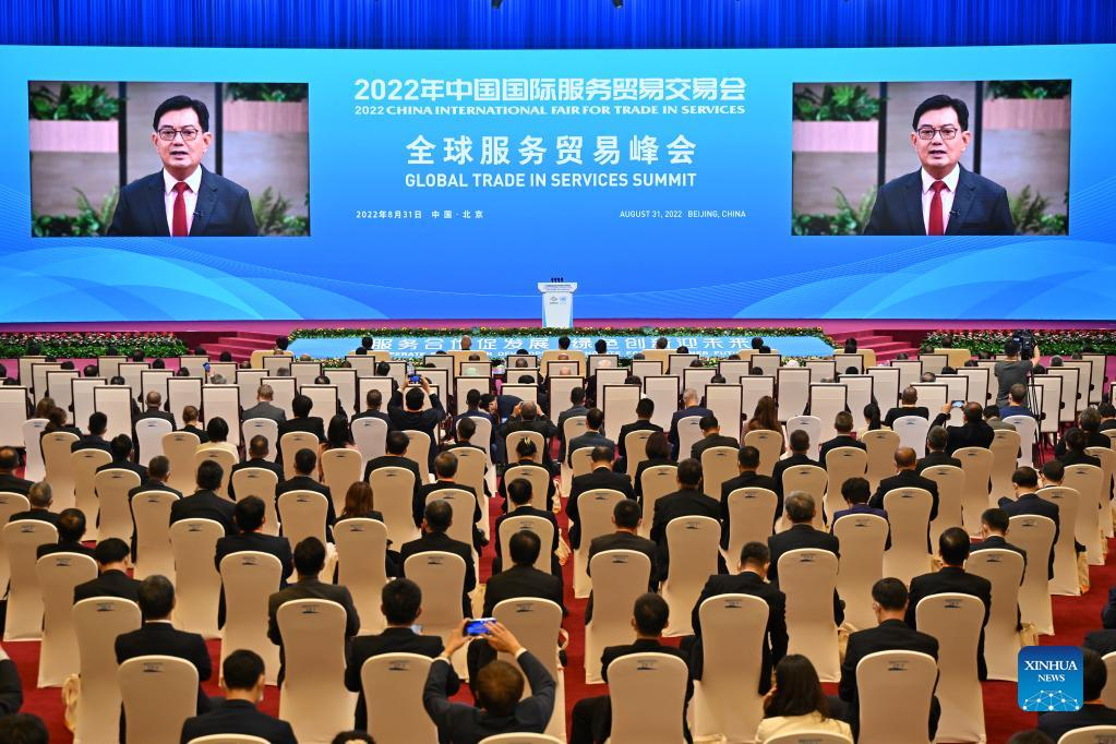 Heng Swee Keat, Singapore's Deputy Prime Minister and Coordinating Minister for Economic Policies, addresses the Summit of 2022 China International Fair for Trade in Services (CIFTIS) via video, Aug. 31, 2022. The summit was held in Beijing on Wednesday. (Xinhua/Li Xin)