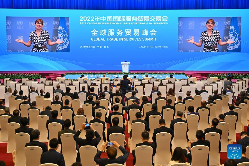 Rebeca Grynspan, Secretary-General of the United Nations Conference on Trade and Development (UNCTAD), addresses the Summit of the 2022 China International Fair for Trade in Services (CIFTIS) via video, Aug. 31, 2022. The summit was held in Beijing on Wednesday. (Xinhua/Li Xin)