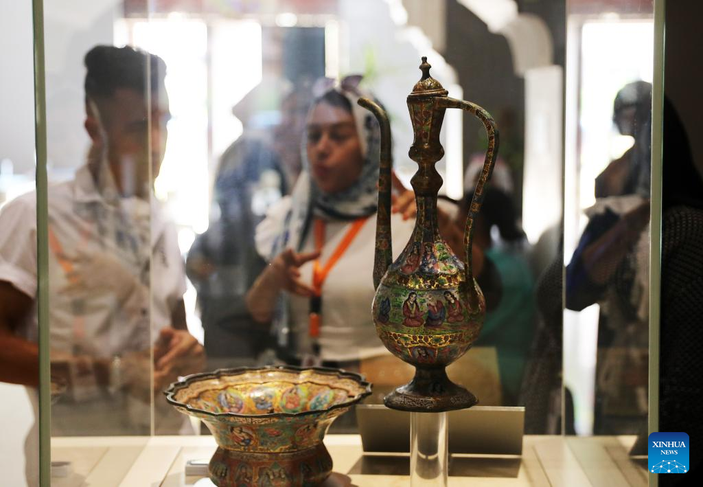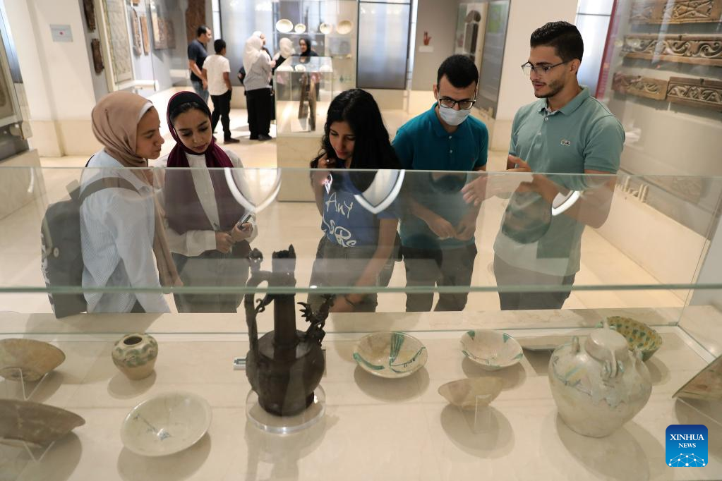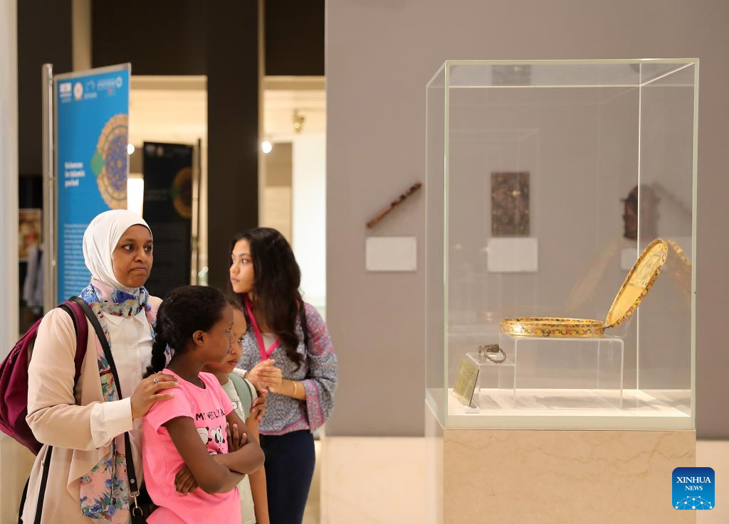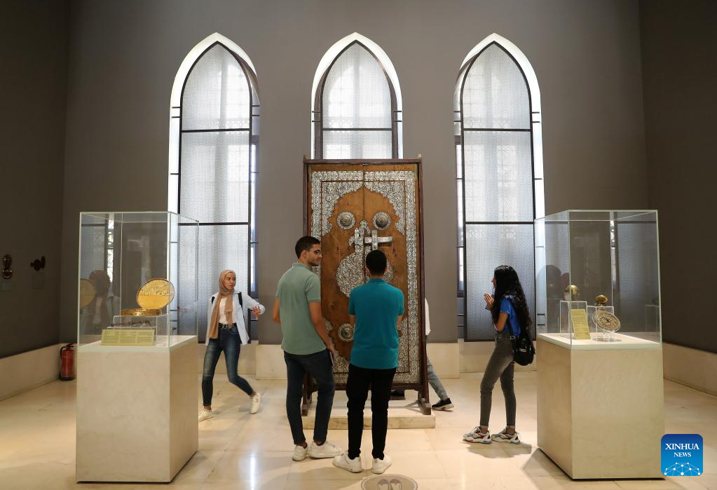 Visitors look at exhibits at Museum of Islamic Art in Cairo, Egypt, on Aug. 31, 2022. Museum of Islamic Art in Cairo, is considered to be one of the largest museums of Islamic art in the world, as it houses close to 100,000 antique Islamic artifacts. (Xinhua/Wang Dongzhen)