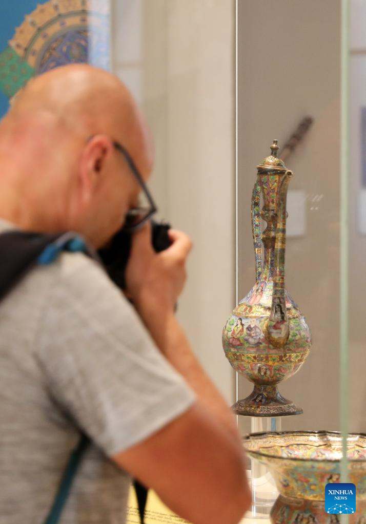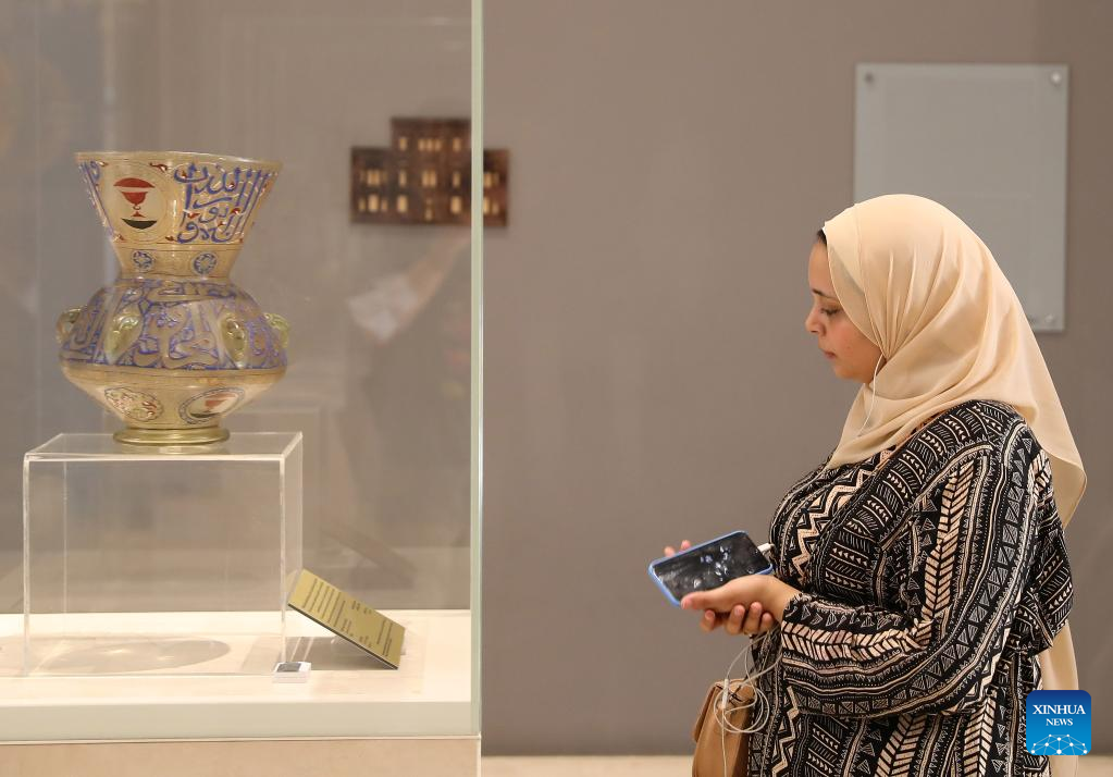 A man takes photos of an exhibit at Museum of Islamic Art in Cairo, Egypt, on Aug. 31, 2022. Museum of Islamic Art in Cairo, is considered to be one of the largest museums of Islamic art in the world, as it houses close to 100,000 antique Islamic artifacts. (Xinhua/Wang Dongzhen)