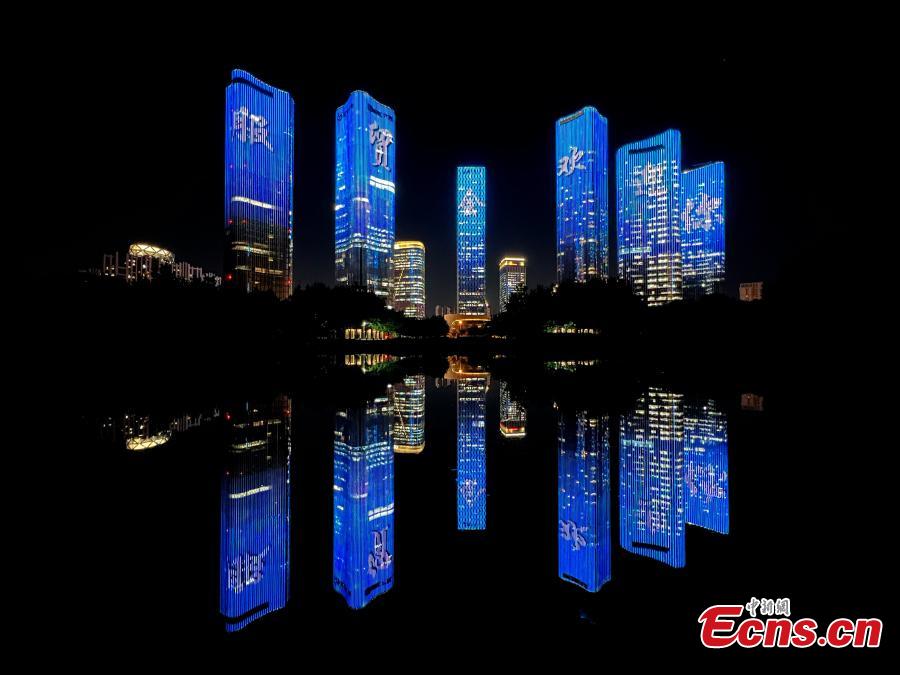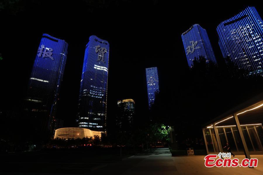 Office buildings at Wangjing area are illuminated with the words "Welcome to China International Fair for Trade in Services (CIFTIS)", Beijing, Aug. 31, 2022. (Photo: China News Service/Han Haidan)