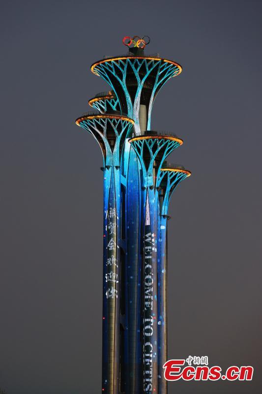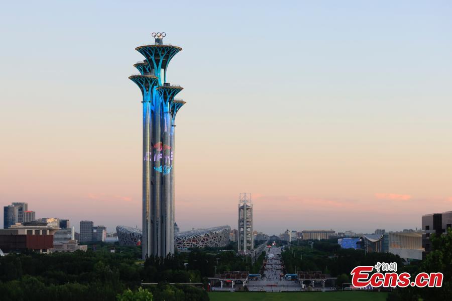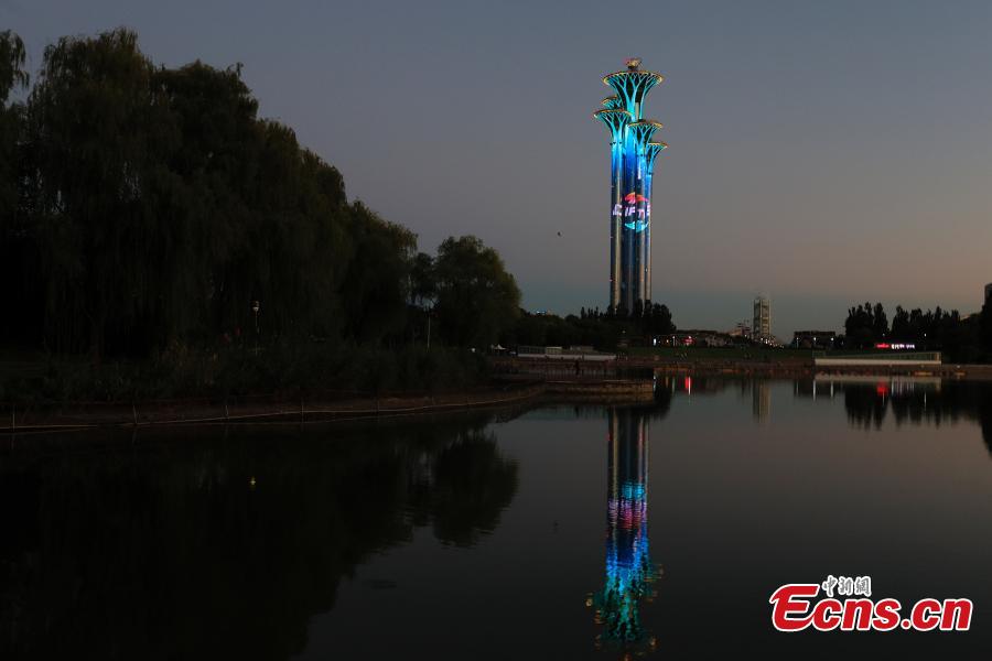The Olympic Tower is illuminated to mark the 2022 China International Fair for Trade in Services (CIFTIS) in Beijing, Aug. 31, 2022. (Photo: China News Service/Han Haidan)