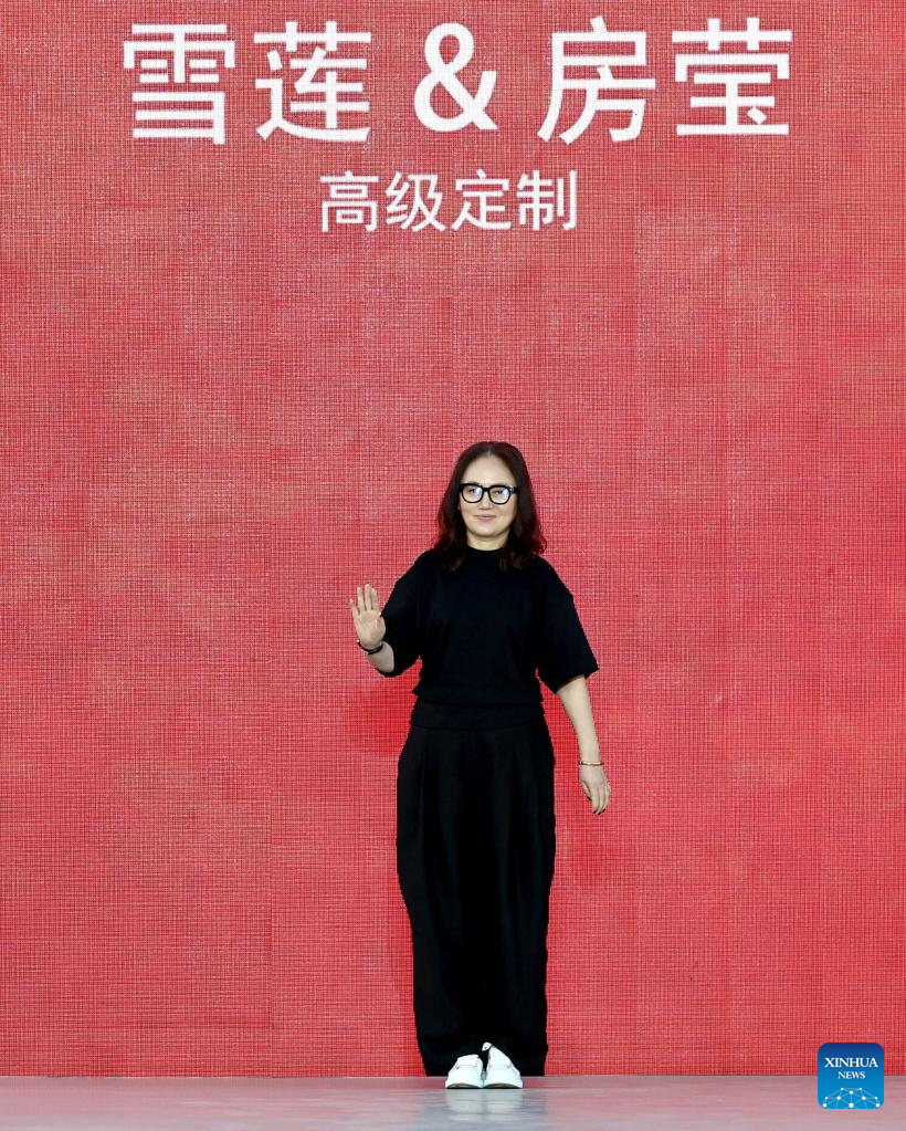 Chinese designer Fang Ying waves to audience during the "Snow Lotus-Fang Ying Haute Couture" fashion show, which is also a part of the 2022 China International Fair for Trade in Services (CIFTIS), at the Shougang Park in Beijing, capital of China, Sept. 1, 2022. (Xinhua/Chen Jianli)