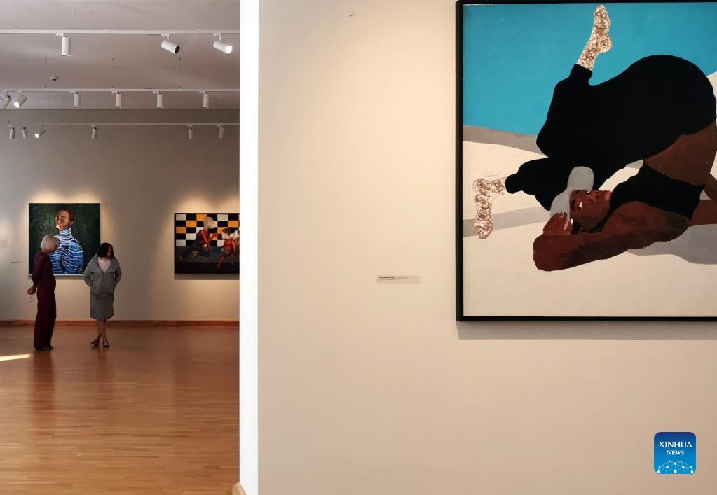 People visit a contemporary African art exhibition in Vilnius, capital of Lithuania, Sept. 1, 2022. More than 30 contemporary African artworks by fifteen artists from six countries are on display. (Photo by Yang Weihua/Xinhua)