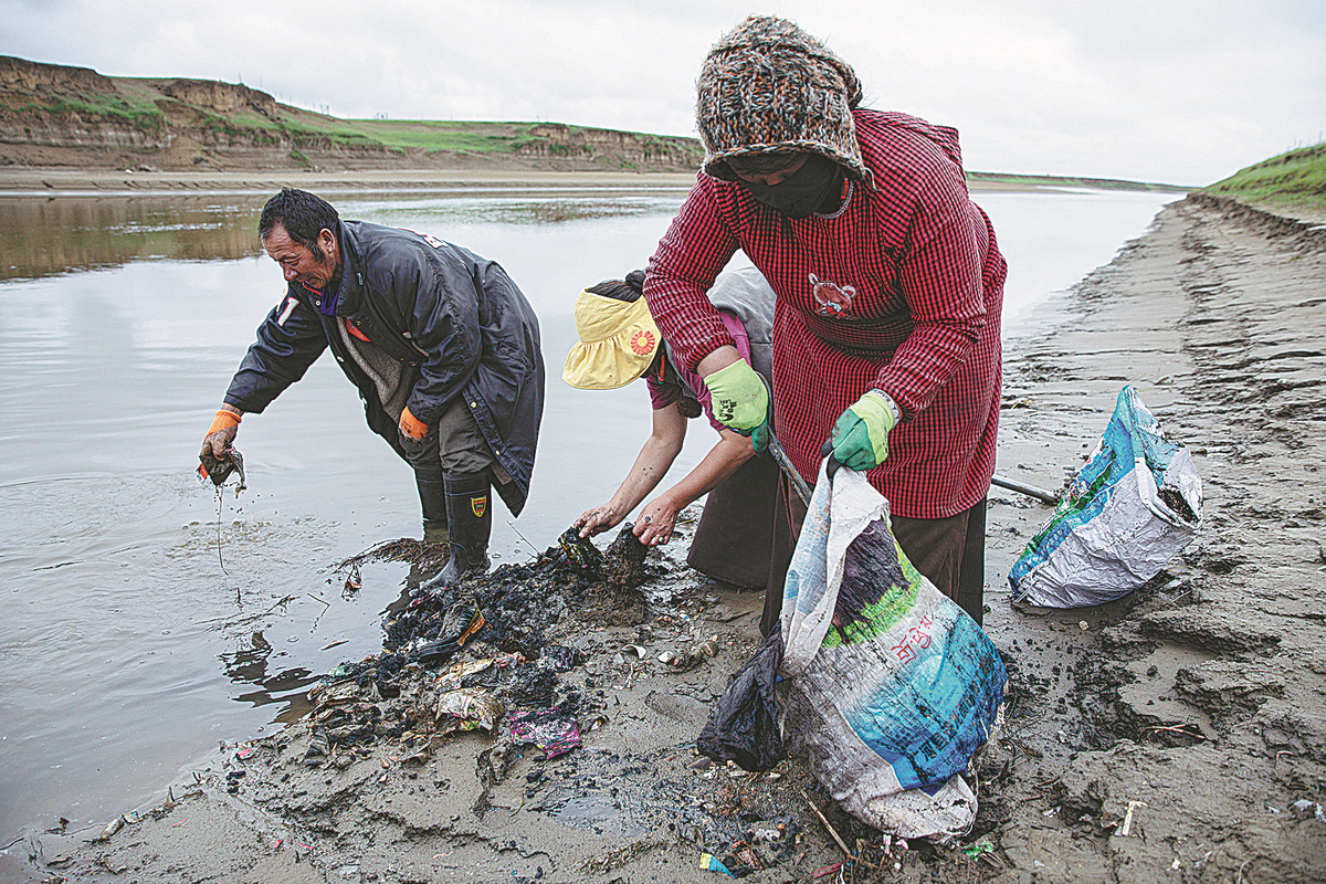 Farmers clean up garbage in Zoige, Sichuan province, where the Heihe River empties into the Yellow River, in July. The farmers patrol the Heihe once or twice a week, and the Yellow River once a month, to clean up and reinforce the banks. JIANG HONGJING/XINHUA