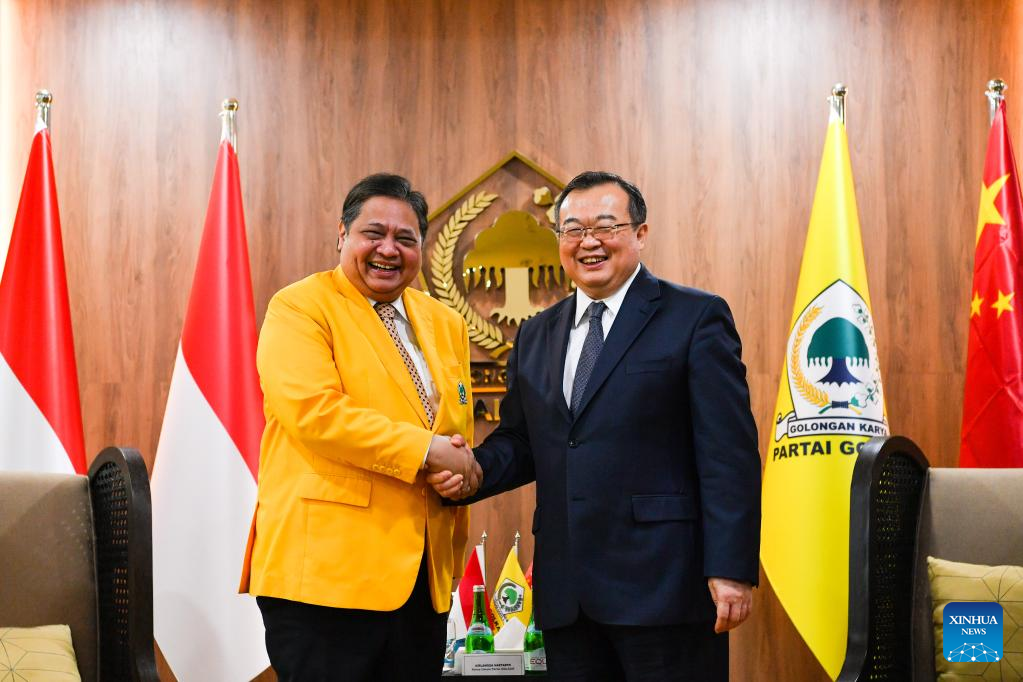 Liu Jianchao (R), head of the International Department of the Communist Party of China Central Committee, meets with Coordinating Minister for Economic Affairs and Chairman of the Golkar Party Airlangga Hartarto in Jakarta, Indonesia, Aug. 31, 2022. (Xinhua/Xu Qin)