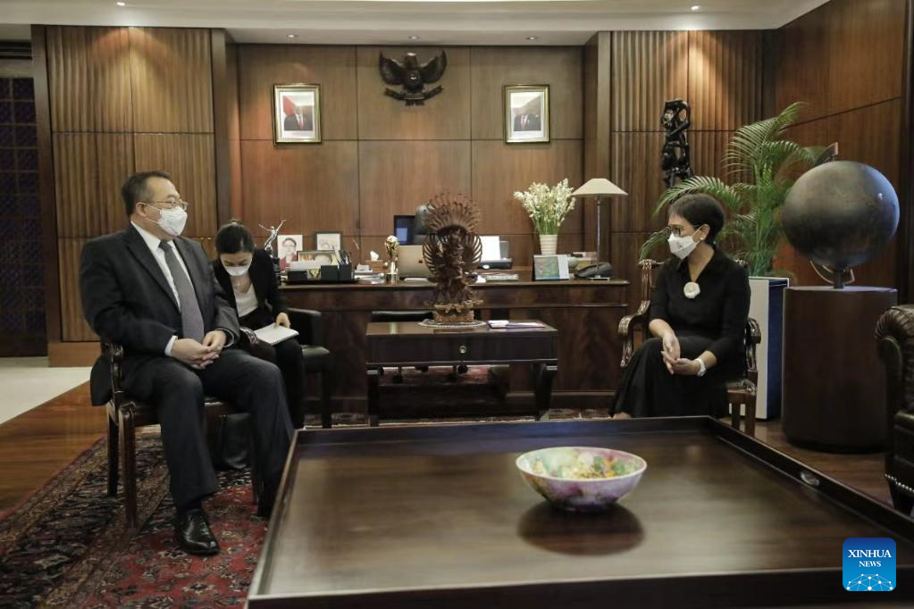 Liu Jianchao (L), head of the International Department of the Communist Party of China Central Committee, meets with Minister for Foreign Affairs Retno Marsudi in Jakarta, Indonesia, Aug. 31, 2022. (Xinhua)