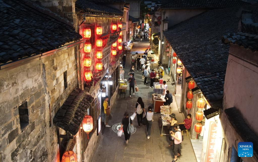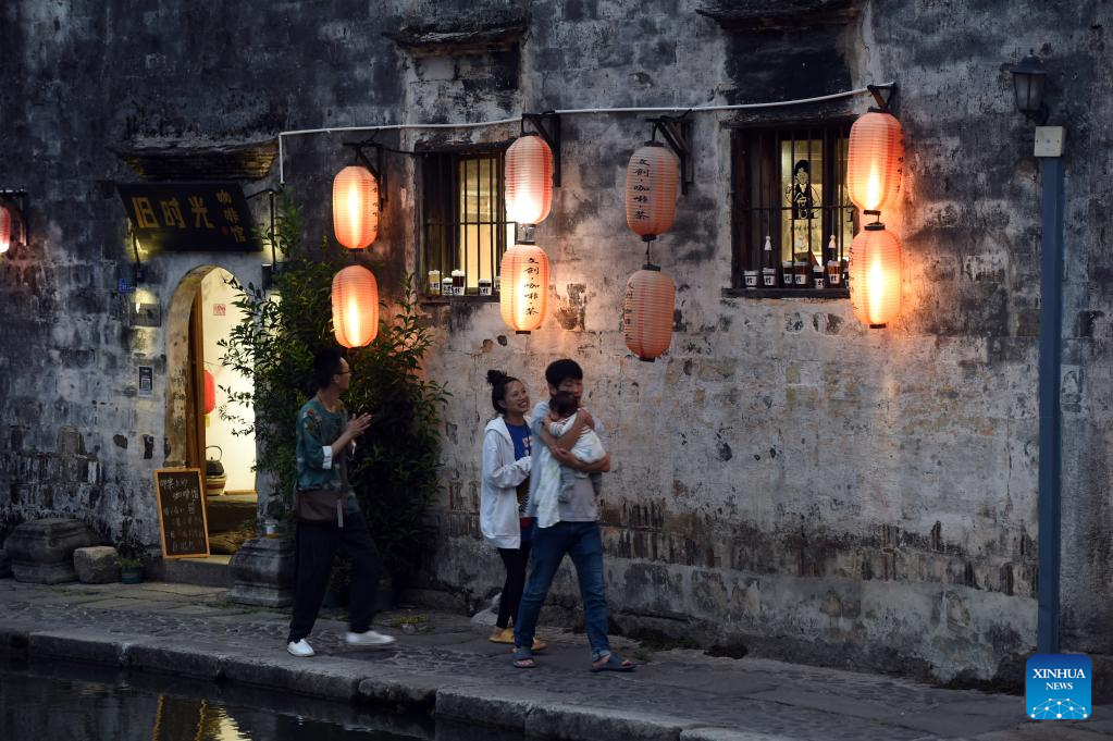 Tourists walk in Hongcun Village in Yixian County, east China's Anhui Province, Aug. 31, 2022. Hongcun Village deeply integrates night economy with tourism industry to promote rural development. (Xinhua/Zhou Mu)
