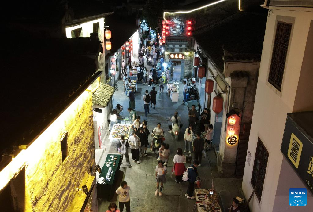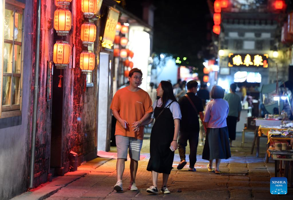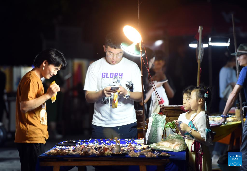 Tourists visit a vendor's stand in Hongcun Village in Yixian County, east China's Anhui Province, Aug. 31, 2022. Hongcun Village deeply integrates night economy with tourism industry to promote rural development. (Xinhua/Zhou Mu)
