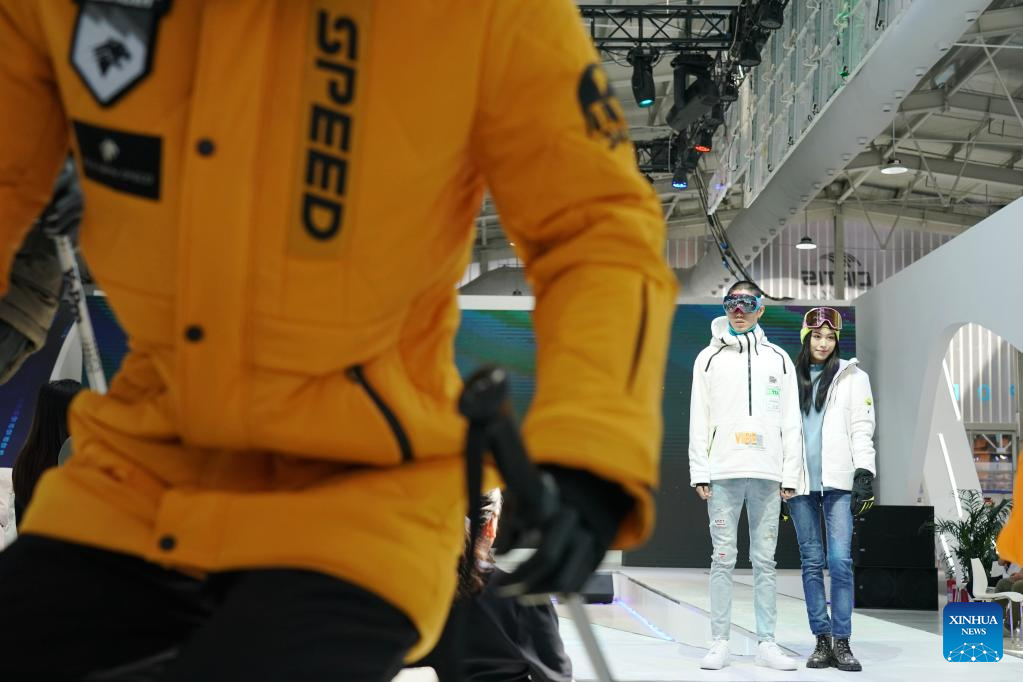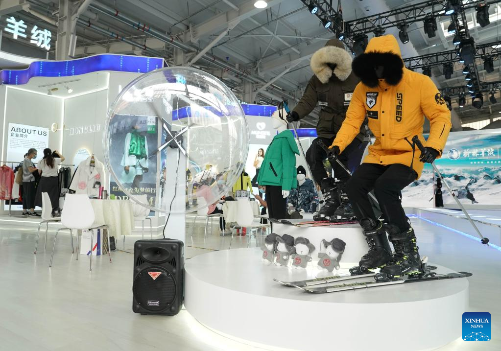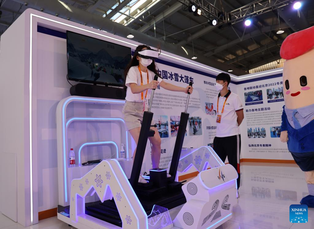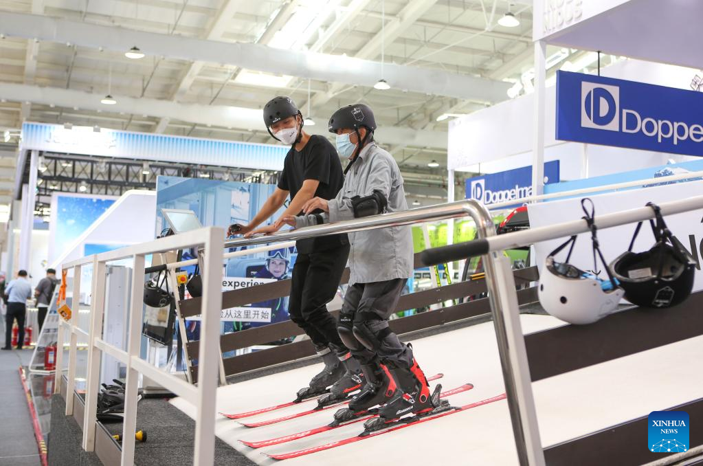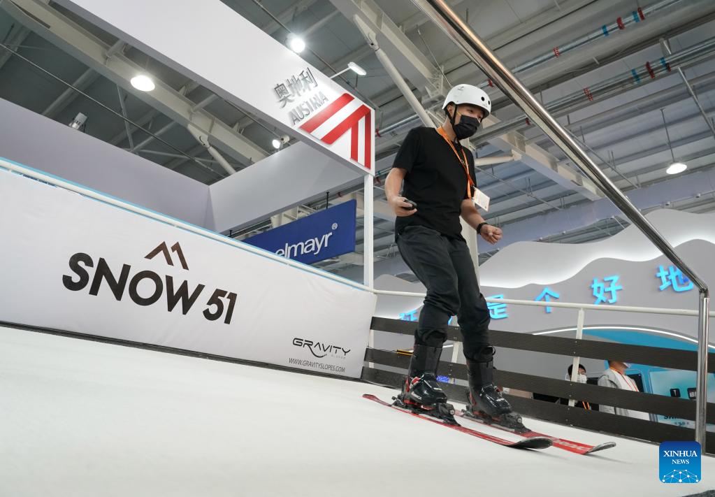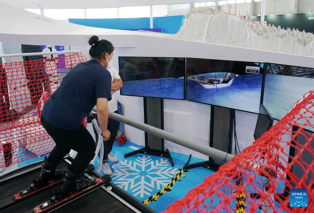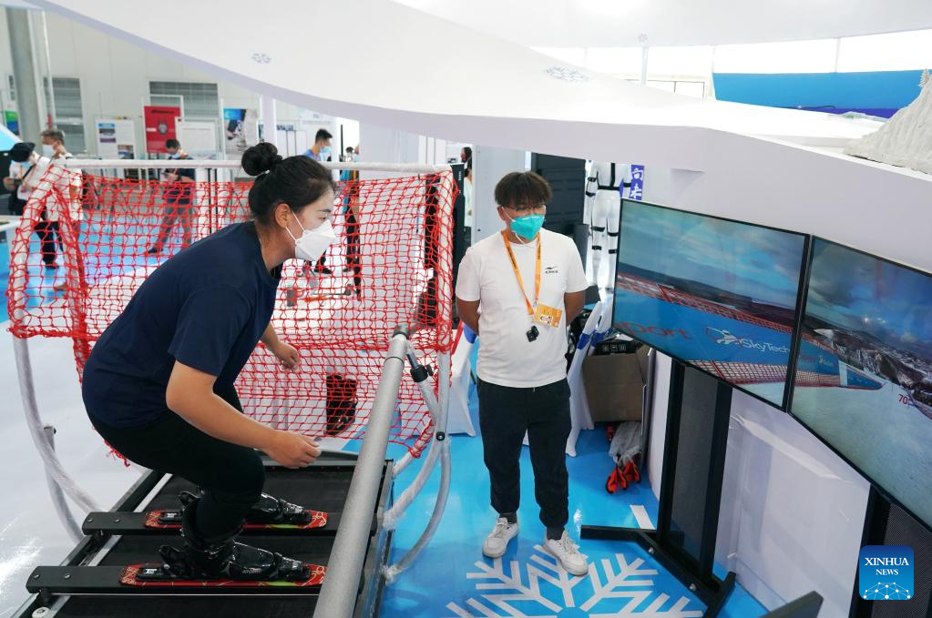A visitor tries a skiing simulator at the sports services exhibition hall during the 2022 China International Fair for Trade in Services (CIFTIS) in Beijing, capital of China, Sept. 2, 2022. The sports services exhibition, which covers an indoor area of 13,200 square meters and an outdoor area of 9,000 square meters, is the largest among all exhibitions staged during the 2022 CIFTIS. (Xinhua/Zhang Chenlin)