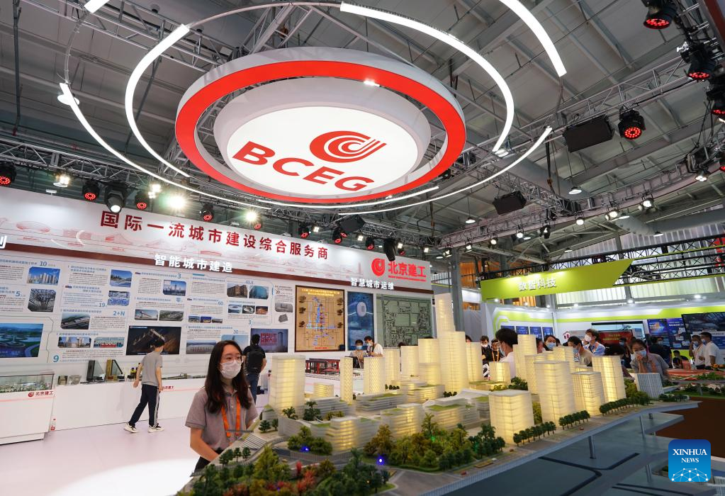 Photo taken on Sept. 2, 2022 shows the engineering consulting and construction services exhibition during the 2022 China International Fair for Trade in Services (CIFTIS) in Beijing, capital of China. The 2022 China International Fair for Trade in Services (CIFTIS) is held in Beijing from Aug. 31 to Sept. 5. The six-day event this year has set up nine thematic exhibitions, including cultural and tourism services, education services, hygiene and health services, engineering consulting and construction services, financial services, supply chain and business services, telecommunication computer and information services, sports services and environmental services. (Xinhua/Jin Haoyuan)