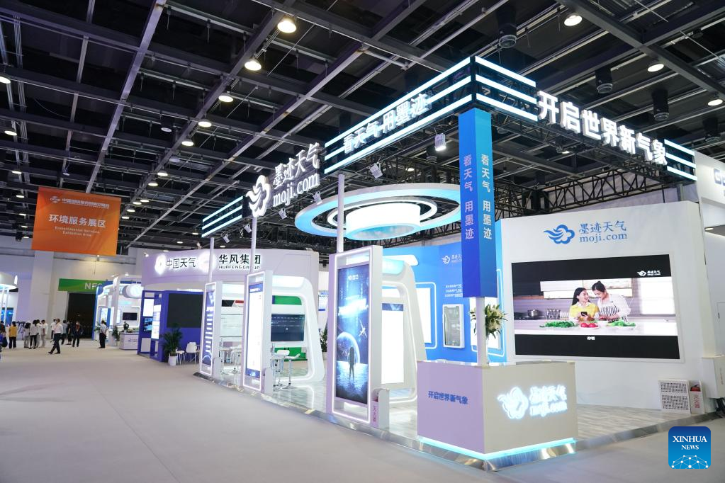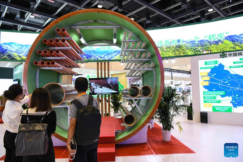Photo taken on Sept. 2, 2022 shows the environmental services exhibition during the 2022 China International Fair for Trade in Services (CIFTIS) in Beijing, capital of China. The 2022 China International Fair for Trade in Services (CIFTIS) is held in Beijing from Aug. 31 to Sept. 5. The six-day event this year has set up nine thematic exhibitions, including cultural and tourism services, education services, hygiene and health services, engineering consulting and construction services, financial services, supply chain and business services, telecommunication computer and information services, sports services and environmental services. (Xinhua/Ren Chao)