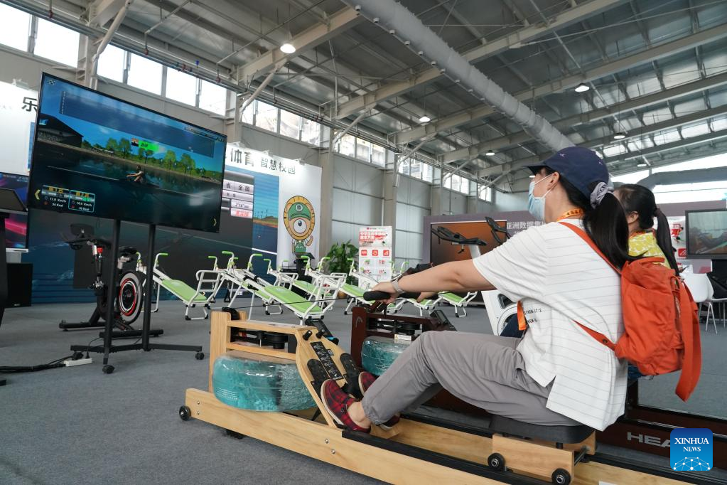 A visitor tries a rowing machine at the sports services exhibition hall during the 2022 China International Fair for Trade in Services (CIFTIS) in Beijing, capital of China, Sept. 2, 2022. The sports services exhibition, which covers an indoor area of 13,200 square meters and an outdoor area of 9,000 square meters, is the largest among all exhibitions staged during the 2022 CIFTIS. (Xinhua/Ren Chao)