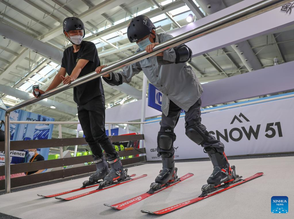 A visitor (R) balances on a skiing simulator at the sports services exhibition hall during the 2022 China International Fair for Trade in Services (CIFTIS) in Beijing, capital of China, Sept. 1, 2022. The sports services exhibition, which covers an indoor area of 13,200 square meters and an outdoor area of 9,000 square meters, is the largest among all exhibitions staged during the 2022 CIFTIS. (Xinhua/Zhang Fan)