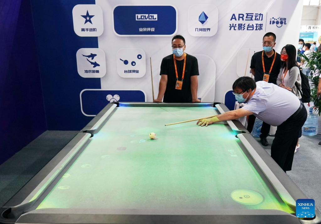 A visitor (front) plays an AR interactive billiard game at the sports services exhibition hall during the 2022 China International Fair for Trade in Services (CIFTIS) in Beijing, capital of China, Sept. 2, 2022. The sports services exhibition, which covers an indoor area of 13,200 square meters and an outdoor area of 9,000 square meters, is the largest among all exhibitions staged during the 2022 CIFTIS. (Xinhua/Zhang Chenlin)