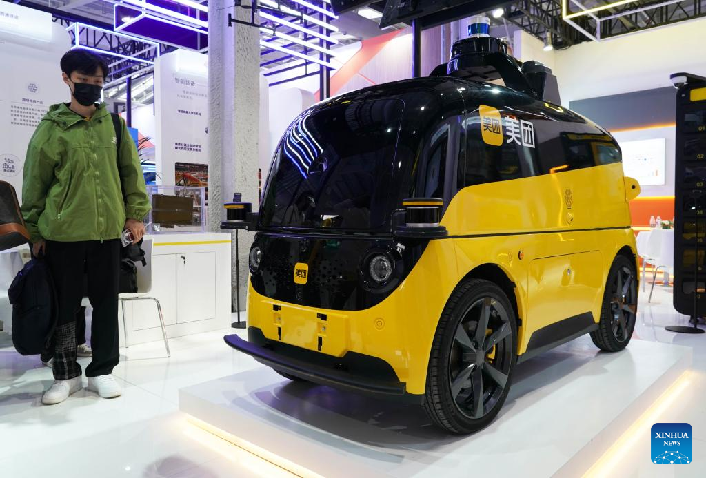Photo taken on Sept. 2, 2022 shows an automatic delivery vehicle at the supply chain and business services exhibition during the 2022 China International Fair for Trade in Services (CIFTIS) in Beijing, capital of China. The 2022 China International Fair for Trade in Services (CIFTIS) is held in Beijing from Aug. 31 to Sept. 5. The six-day event this year has set up nine thematic exhibitions, including cultural and tourism services, education services, hygiene and health services, engineering consulting and construction services, financial services, supply chain and business services, telecommunication computer and information services, sports services and environmental services. (Xinhua/Ren Chao)