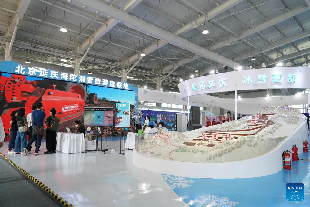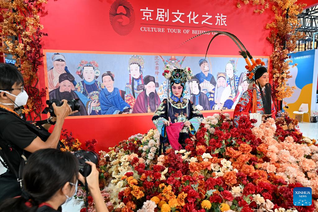 Photo taken on Sept. 2, 2022 shows the cultural and tourism services exhibition during the 2022 China International Fair for Trade in Services (CIFTIS) in Beijing, capital of China. The 2022 China International Fair for Trade in Services (CIFTIS) is held in Beijing from Aug. 31 to Sept. 5. The six-day event this year has set up nine thematic exhibitions, including cultural and tourism services, education services, hygiene and health services, engineering consulting and construction services, financial services, supply chain and business services, telecommunication computer and information services, sports services and environmental services. (Xinhua/Li Xin)