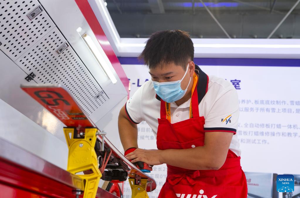A staff member demonstrates snowboard maintenance procedure at the sports services exhibition hall during the 2022 China International Fair for Trade in Services (CIFTIS) in Beijing, capital of China, Sept. 1, 2022. The sports services exhibition, which covers an indoor area of 13,200 square meters and an outdoor area of 9,000 square meters, is the largest among all exhibitions staged during the 2022 CIFTIS. (Xinhua/Zhang Fan)
