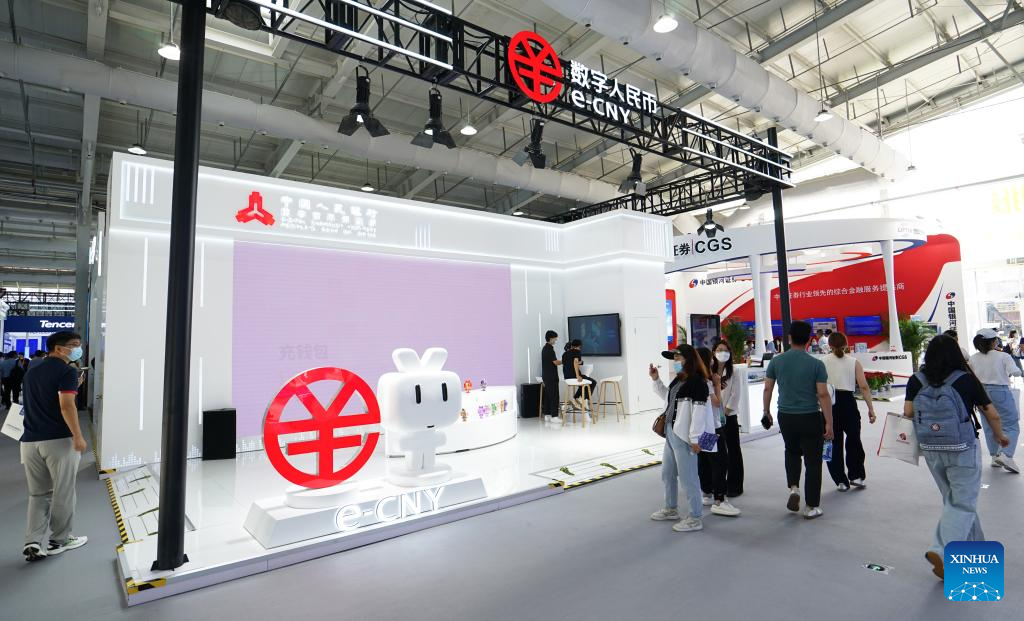 Photo taken on Sept. 2, 2022 shows the financial services exhibition during the 2022 China International Fair for Trade in Services (CIFTIS) in Beijing, capital of China. The 2022 China International Fair for Trade in Services (CIFTIS) is held in Beijing from Aug. 31 to Sept. 5. The six-day event this year has set up nine thematic exhibitions, including cultural and tourism services, education services, hygiene and health services, engineering consulting and construction services, financial services, supply chain and business services, telecommunication computer and information services, sports services and environmental services. (Xinhua/Jin Haoyuan)