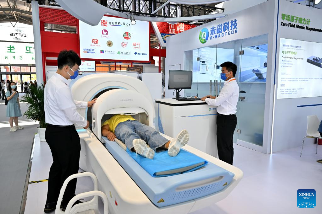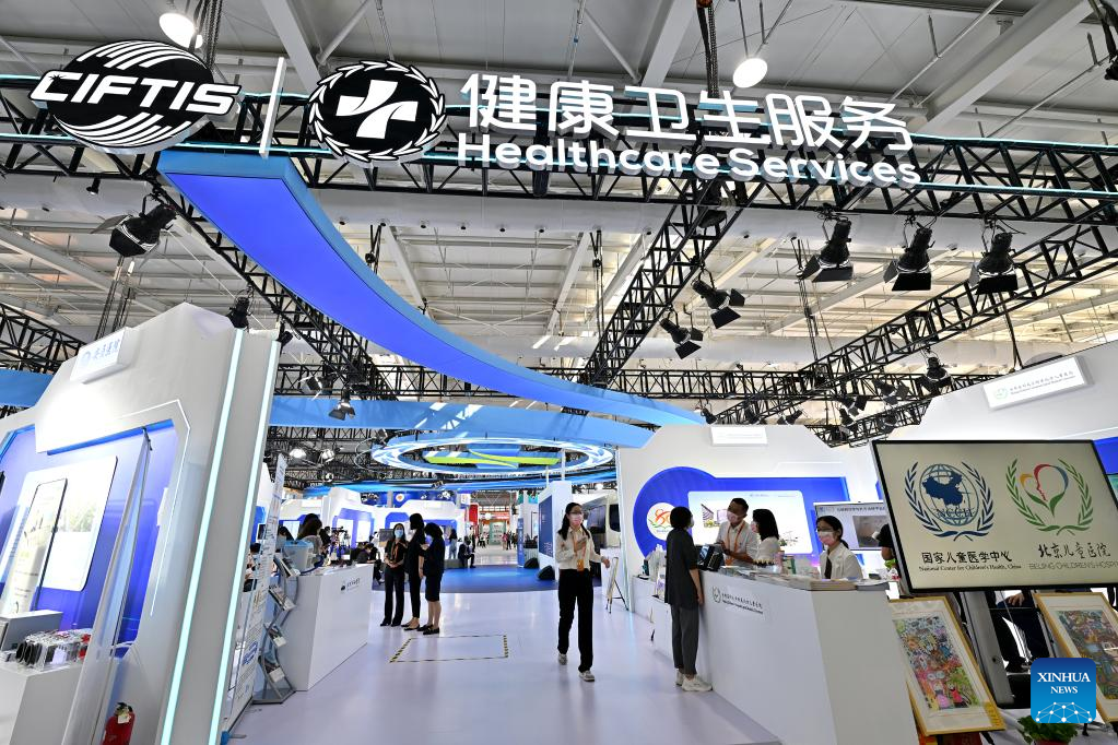 Photo taken on Sept. 2, 2022 shows the hygiene and health services exhibition during the 2022 China International Fair for Trade in Services (CIFTIS) in Beijing, capital of China. The 2022 China International Fair for Trade in Services (CIFTIS) is held in Beijing from Aug. 31 to Sept. 5. The six-day event this year has set up nine thematic exhibitions, including cultural and tourism services, education services, hygiene and health services, engineering consulting and construction services, financial services, supply chain and business services, telecommunication computer and information services, sports services and environmental services. (Xinhua/Li Xin)