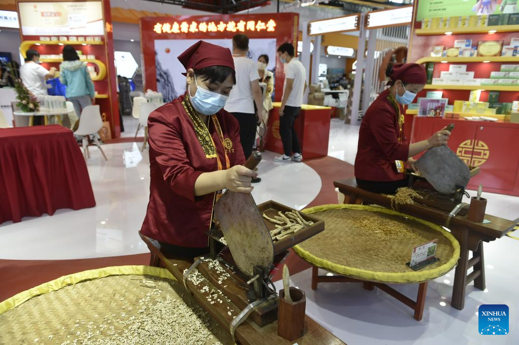 Staff members demonstrate traditional Chinese medicine (TCM) processing skills at the hygiene and health services exhibition during the 2022 China International Fair for Trade in Services (CIFTIS) in Beijing, capital of China, Sept. 1, 2022. The 2022 China International Fair for Trade in Services (CIFTIS) is held in Beijing from Aug. 31 to Sept. 5. The six-day event this year has set up nine thematic exhibitions, including cultural and tourism services, education services, hygiene and health services, engineering consulting and construction services, financial services, supply chain and business services, telecommunication computer and information services, sports services and environmental services. (Xinhua/Lu Peng)