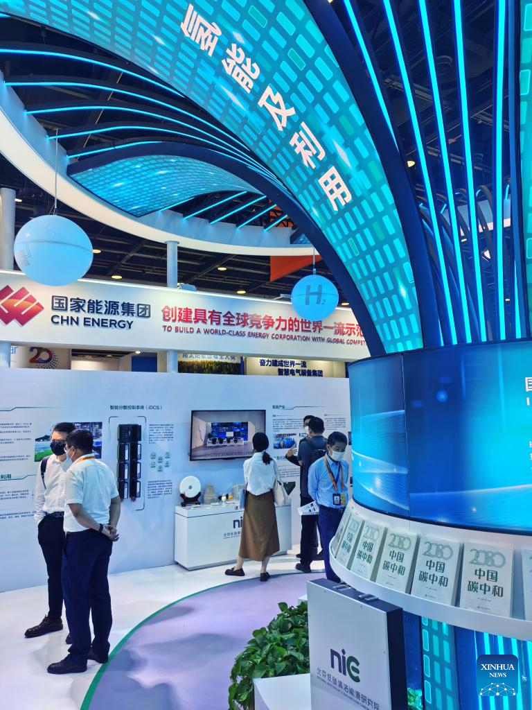 Photo taken on Sept. 2, 2022 shows the environmental services exhibition during the 2022 China International Fair for Trade in Services (CIFTIS) in Beijing, capital of China. The 2022 China International Fair for Trade in Services (CIFTIS) is held in Beijing from Aug. 31 to Sept. 5. The six-day event this year has set up nine thematic exhibitions, including cultural and tourism services, education services, hygiene and health services, engineering consulting and construction services, financial services, supply chain and business services, telecommunication computer and information services, sports services and environmental services. (Xinhua/Ding Hongfa)