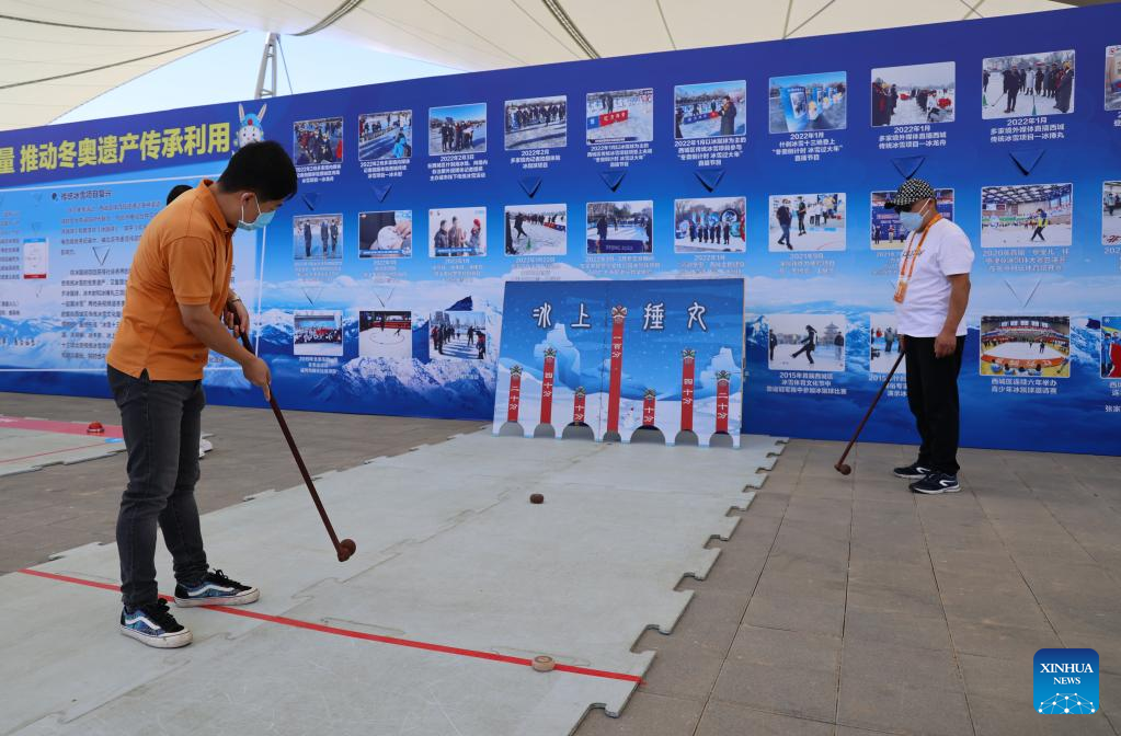 A visitor (L) plays an ice game at the sports services exhibition hall during the 2022 China International Fair for Trade in Services (CIFTIS) in Beijing, capital of China, Sept. 1, 2022. The sports services exhibition, which covers an indoor area of 13,200 square meters and an outdoor area of 9,000 square meters, is the largest among all exhibitions staged during the 2022 CIFTIS. (Xinhua/Qi Xiaoyi)