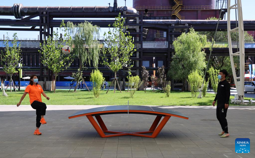 People demonstrate the teqball game at the sports services exhibition hall during the 2022 China International Fair for Trade in Services (CIFTIS) in Beijing, capital of China, Sept. 1, 2022. The sports services exhibition, which covers an indoor area of 13,200 square meters and an outdoor area of 9,000 square meters, is the largest among all exhibitions staged during the 2022 CIFTIS. (Xinhua/Qi Xiaoyi)
