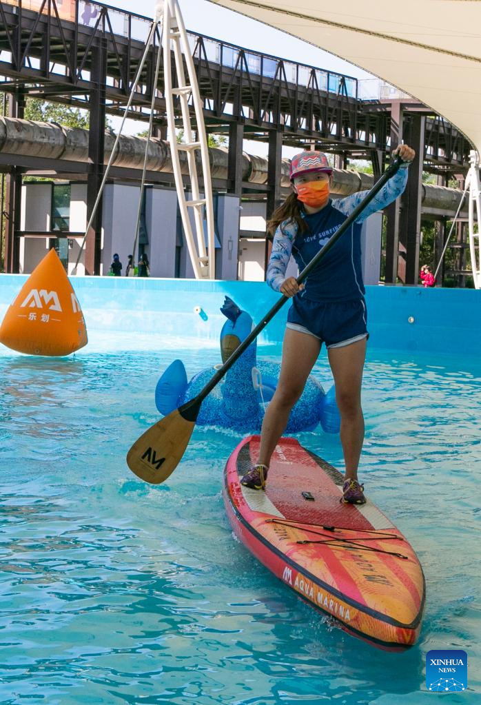 A trainer demonstrates paddleboarding at the sports services exhibition hall during the 2022 China International Fair for Trade in Services (CIFTIS) in Beijing, capital of China, Sept. 1, 2022. The sports services exhibition, which covers an indoor area of 13,200 square meters and an outdoor area of 9,000 square meters, is the largest among all exhibitions staged during the 2022 CIFTIS. (Xinhua/Zhang Fan)