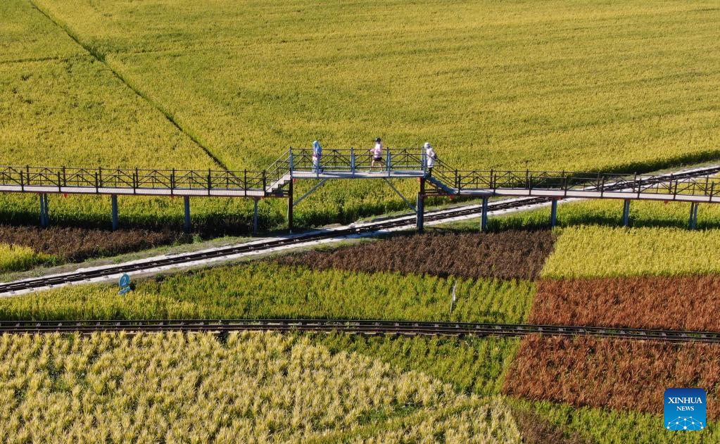 Aerial photo taken on Sept. 1, 2022 shows tourists viewing scenery in paddy fields in Shenyang, northeast China's Liaoning Province. (Xinhua/Yang Qing)