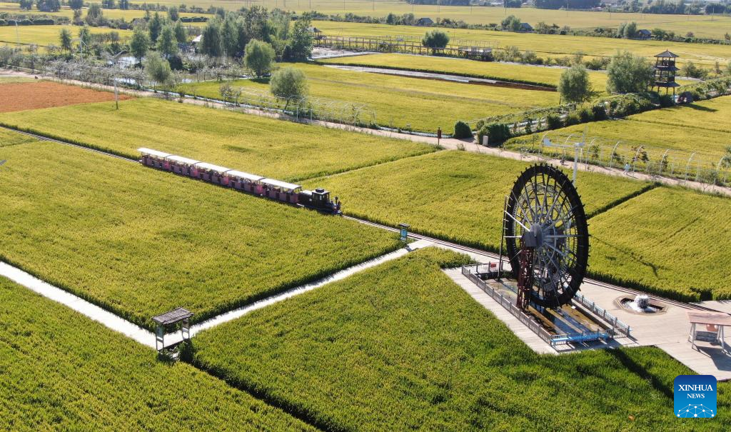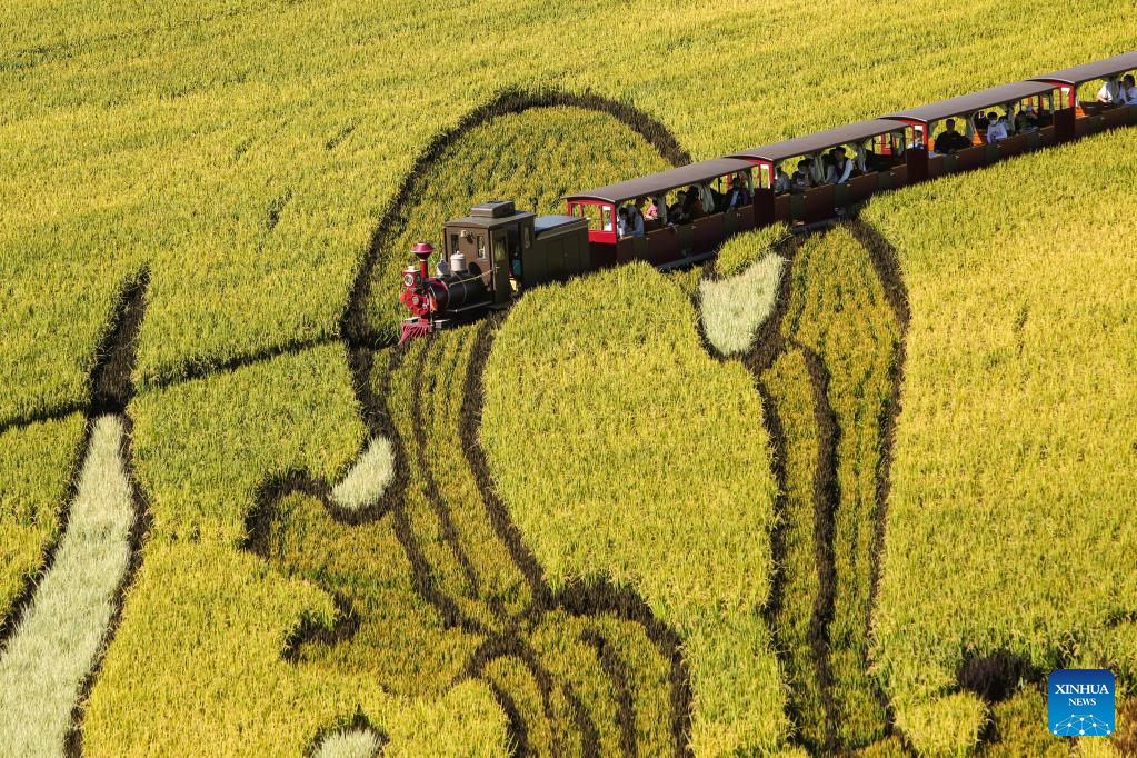 Aerial photo taken on Sept. 1, 2022 shows tourists viewing scenery on a train in paddy fields in Shenyang, northeast China's Liaoning Province. (Xinhua/Yang Qing)