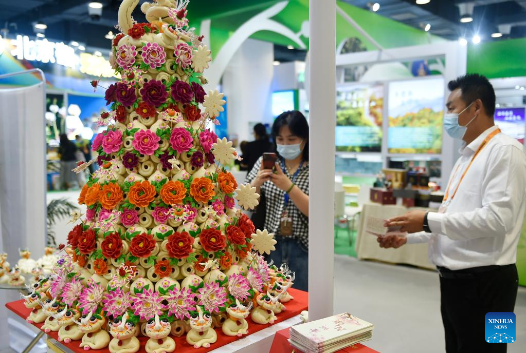 A visitor takes photos of Huamo, steamed buns with elaborate flowery decorations, during the 2022 China International Fair for Trade in Services (CIFTIS) in Beijing, capital of China, Sept. 2, 2022. The 2022 CIFTIS is held in Beijing from Aug. 31 to Sept. 5 at the China National Convention Center and Shougang Park. (Xinhua/Lu Peng)