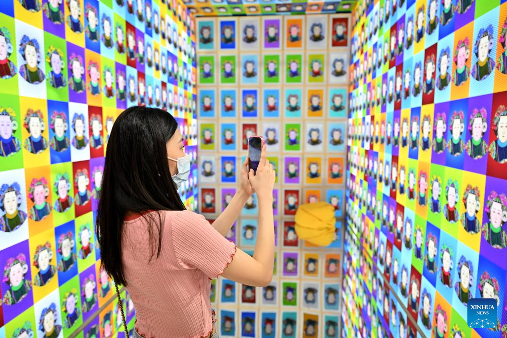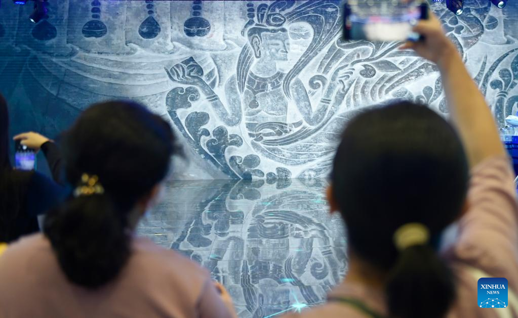 A visitor takes photos of an artwork recreated with digital technology during the 2022 China International Fair for Trade in Services (CIFTIS) in Beijing, capital of China, Sept. 2, 2022. The 2022 CIFTIS is held in Beijing from Aug. 31 to Sept. 5 at the China National Convention Center and Shougang Park. (Xinhua/Li Xin)