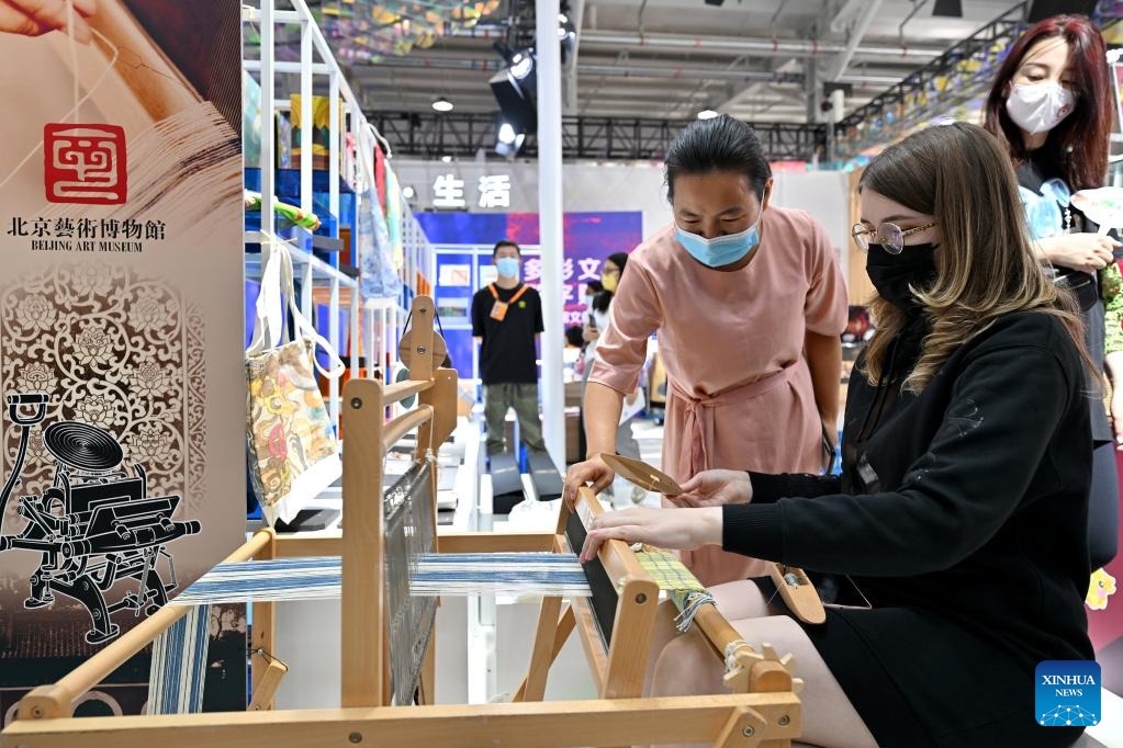 A visitor tries her hands on a traditional loom during the 2022 China International Fair for Trade in Services (CIFTIS) in Beijing, capital of China, Sept. 2, 2022. The 2022 CIFTIS is held in Beijing from Aug. 31 to Sept. 5 at the China National Convention Center and Shougang Park. (Xinhua/Li Xin)