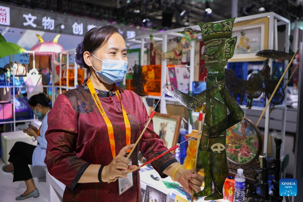 An exhibitor shows shadow play during the 2022 China International Fair for Trade in Services (CIFTIS) in Beijing, capital of China, Sept. 2, 2022. The 2022 CIFTIS is held in Beijing from Aug. 31 to Sept. 5 at the China National Convention Center and Shougang Park. (Xinhua/Hao Zhao)