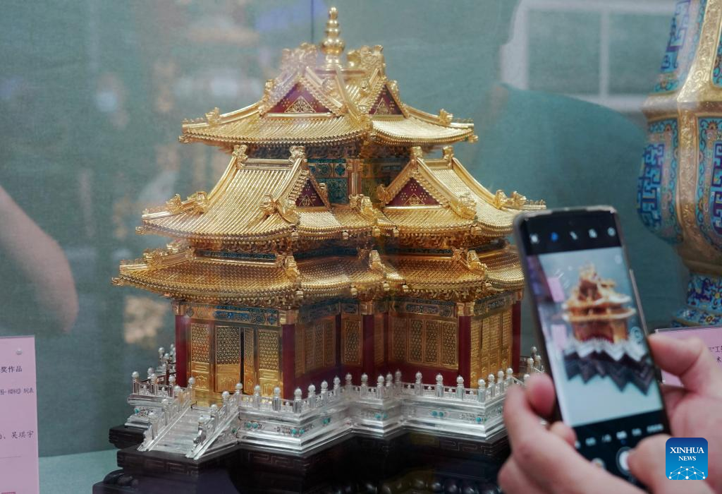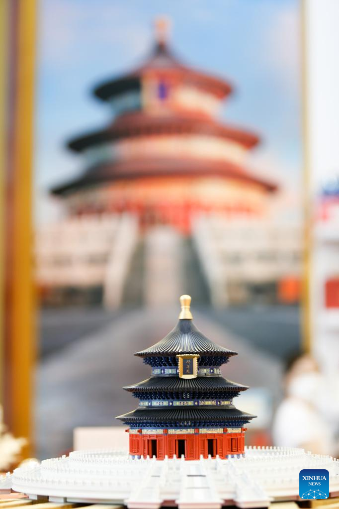A model of the Hall of Prayer for Good Harvest of the Temple of Heaven is seen during the 2022 China International Fair for Trade in Services (CIFTIS) in Beijing, capital of China, Sept. 1, 2022. The 2022 CIFTIS is held in Beijing from Aug. 31 to Sept. 5 at the China National Convention Center and Shougang Park. (Xinhua/Ding Hongfa)
