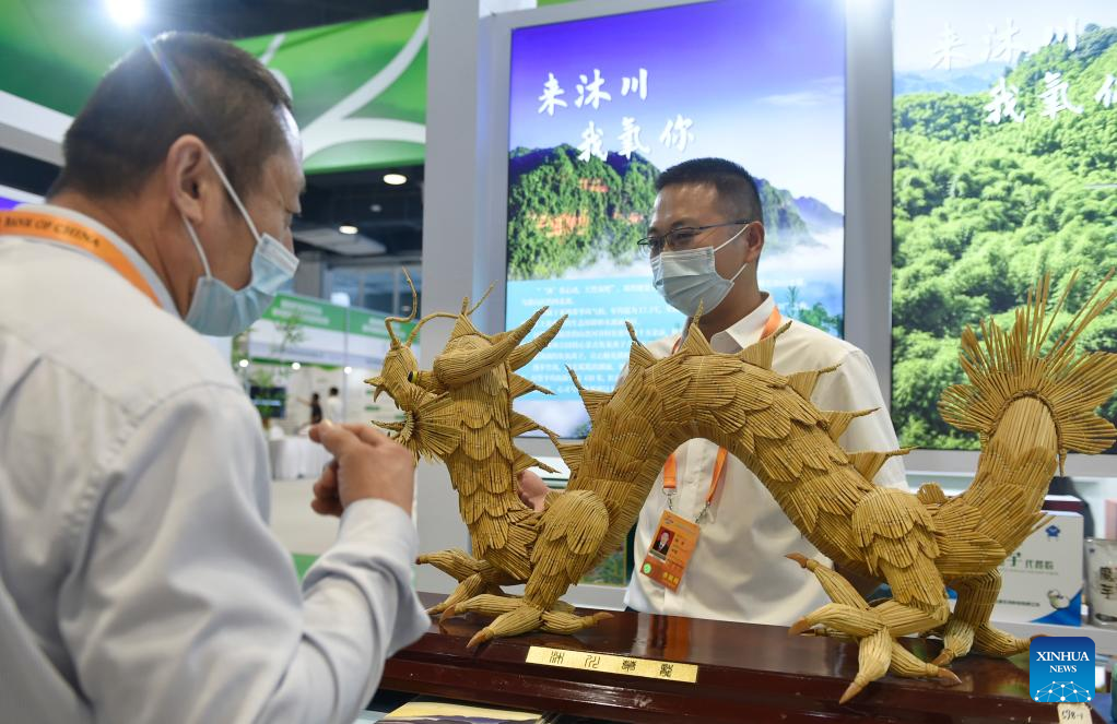 A staff member (R) shows a dragon-shaped artwork made by straws as a visitor looks on during the 2022 China International Fair for Trade in Services (CIFTIS) in Beijing, capital of China, Sept. 2, 2022. The 2022 CIFTIS is held in Beijing from Aug. 31 to Sept. 5 at the China National Convention Center and Shougang Park. (Xinhua/Lu Peng)