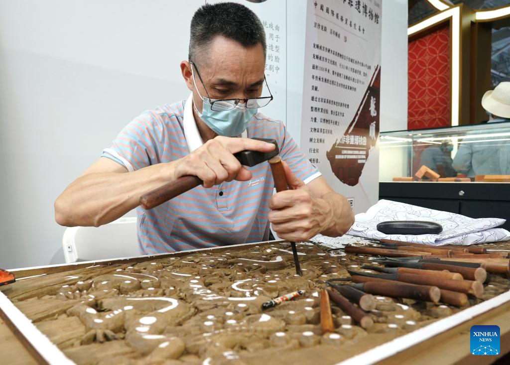 An exhibitor demonstrates handmade wood carving skills during the 2022 China International Fair for Trade in Services (CIFTIS) in Beijing, capital of China, Sept. 2, 2022. The 2022 CIFTIS is held in Beijing from Aug. 31 to Sept. 5 at the China National Convention Center and Shougang Park. (Xinhua/Zhang Chenlin)