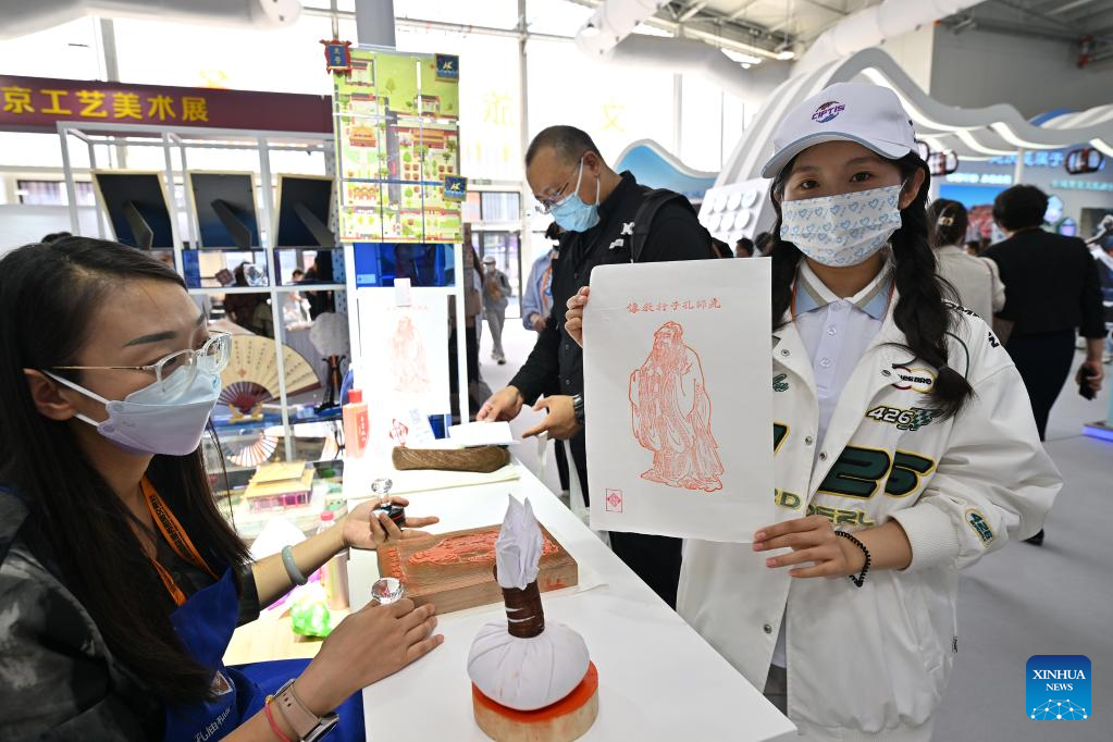 A visitor shows a woodblock printing work during the 2022 China International Fair for Trade in Services (CIFTIS) in Beijing, capital of China, Sept. 2, 2022. The 2022 CIFTIS is held in Beijing from Aug. 31 to Sept. 5 at the China National Convention Center and Shougang Park. (Xinhua/Li Xin)
