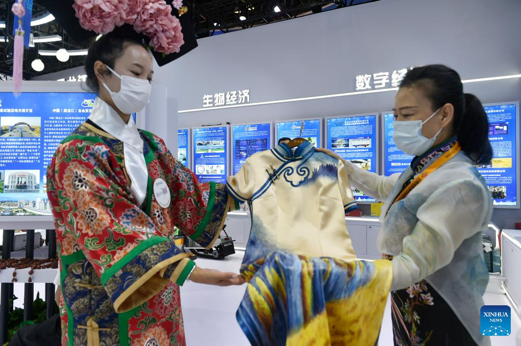 A staff member (L) and a designer show Chinese traditional Qipao dress during the 2022 China International Fair for Trade in Services (CIFTIS) in Beijing, capital of China, Sept. 2, 2022. The 2022 CIFTIS is held in Beijing from Aug. 31 to Sept. 5 at the China National Convention Center and Shougang Park. (Xinhua/Lu Peng)